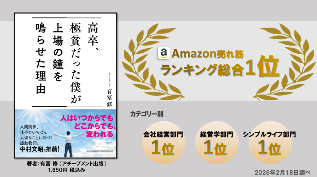 この度、弊社代表 有冨修の初著書『高卒、極貧だった僕が上場の鐘を鳴らせた理由』が、Amazon売れ筋ランキングで快挙を達成しました!