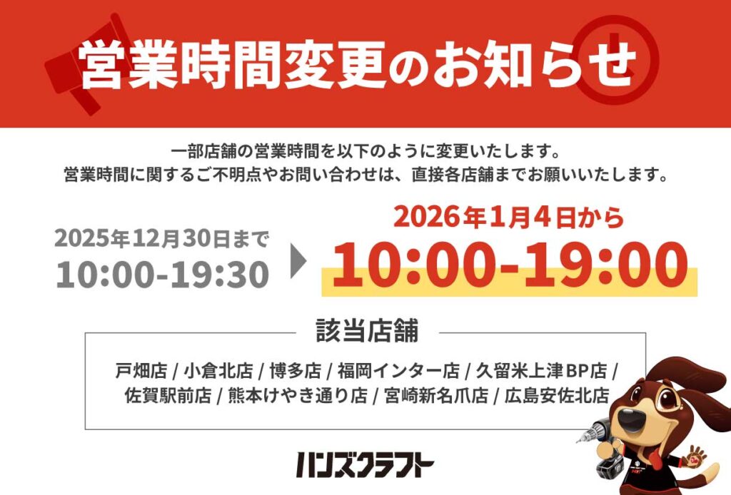 ハンズクラフト 戸畑店/小倉北店/博多店/福岡インター店/佐賀駅前店/久留米上津BP店/熊本けやき通り店/宮崎新名爪店/広島安佐北店