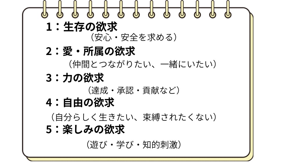 そうだね。選択理論心理学では、人間の欲求を5つに分類しているんですよ。